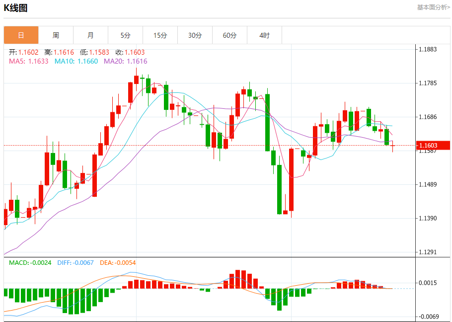 汇价高见1.1616,低见1.1583。上一交易日,汇价收于1.1605。