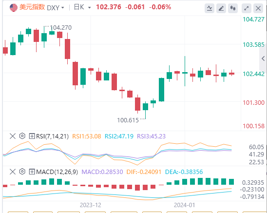 美元指数一直在102-103区间内移动,并可能在未来几个交易日继续这样的走势。自去年10月以来,美元总体趋势一直是向下。只要美元指数维持在103下方,那么未来几周可能有进一步跌向102-101.50的空间。