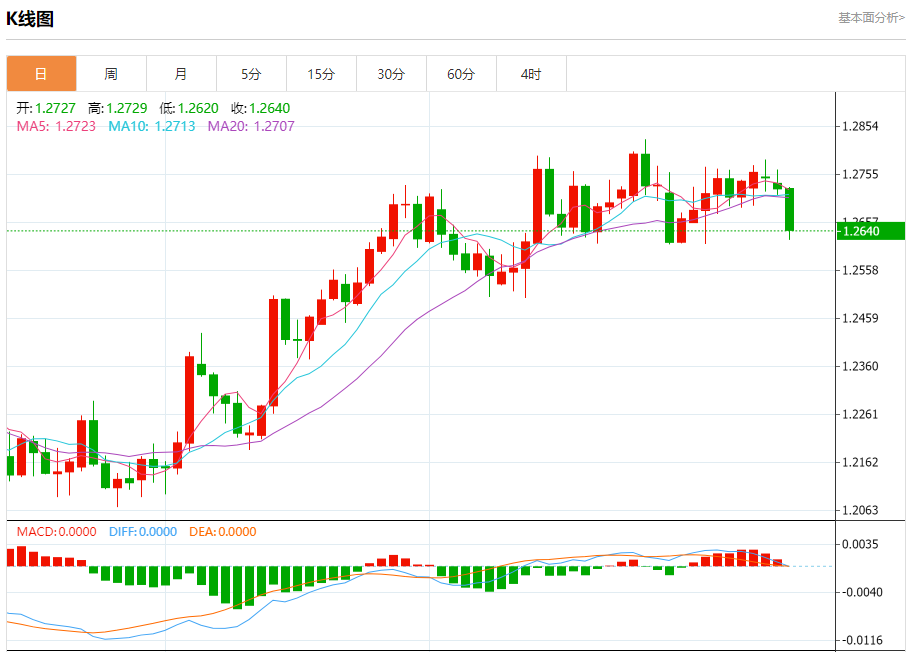 汇价高见1.2729,低见1.2620。上一交易日,汇价收于1.2726。