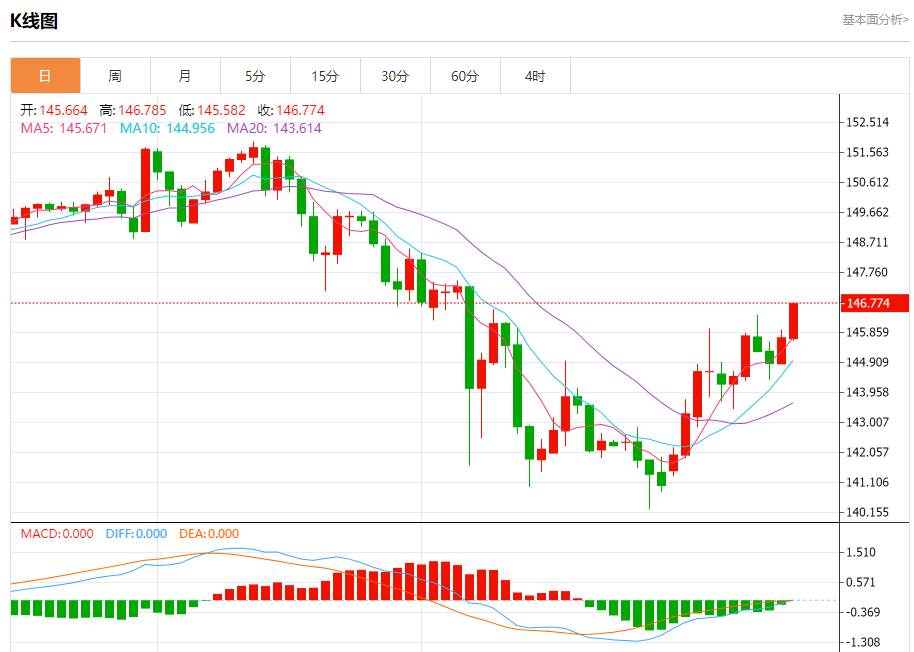 汇价高见146.785,低见145.582。上一交易日,汇价收于145.691。