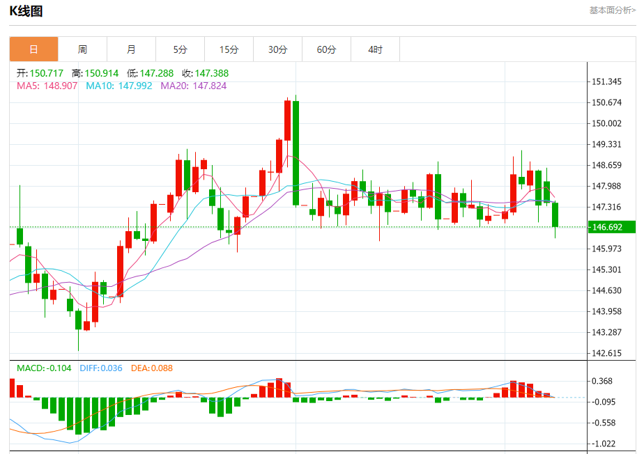 汇价高见147.517,低见146.295。上一交易日,汇价收于147.461。