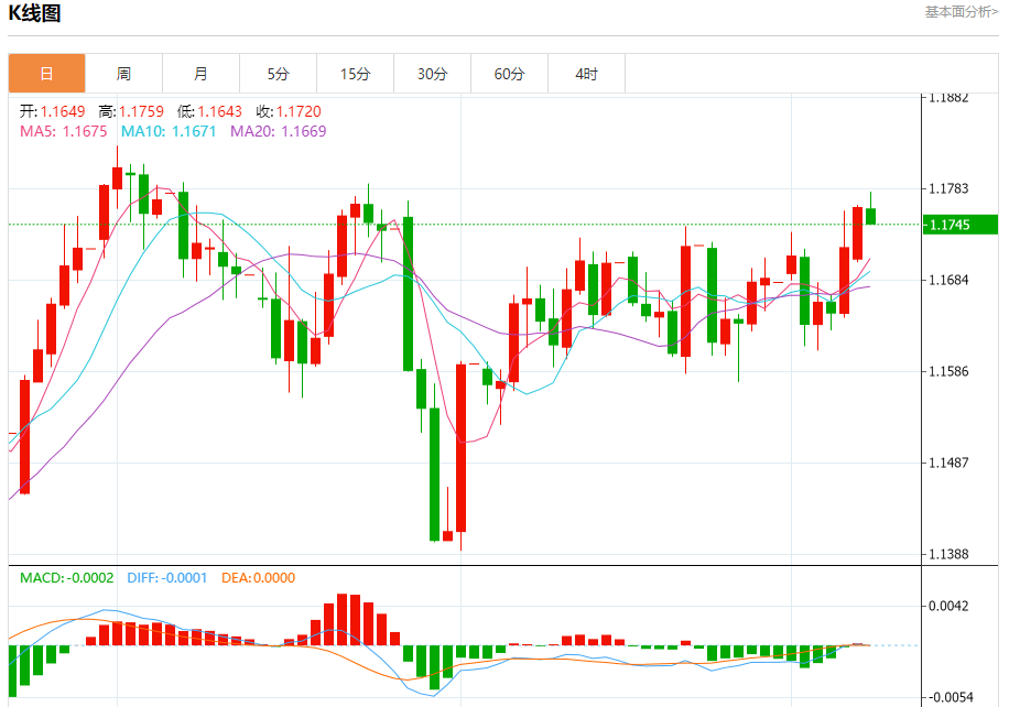汇价高见1.1780,低见1.1744。上一交易日,汇价收于1.1763。