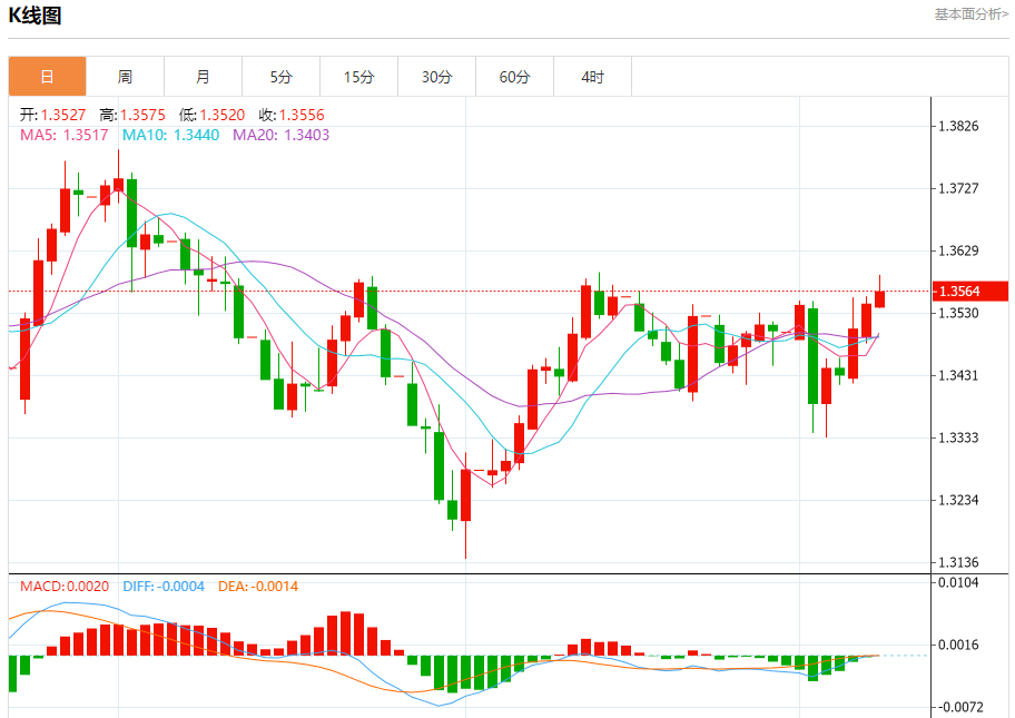 汇价高见1.3590,低见1.3537。上一交易日,汇价收于1.3544。