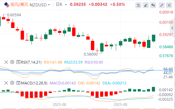 该货币对连续第二天走高,盘中高点触及0.5920上方,为8月19日以来的最高水平。周五从0.5840下方水平的脉冲反弹表明该货币对可能有望进一步复苏。