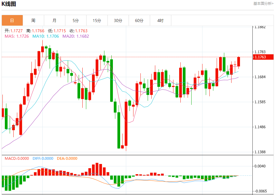 汇价高见1.1763,低见1.1716。上一交易日,汇价收于1.1730。