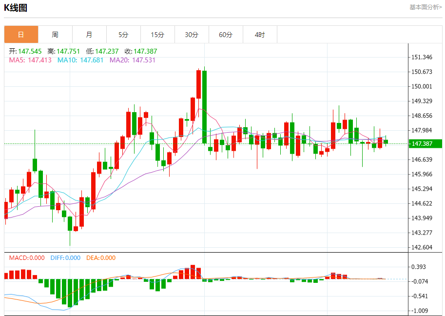 汇价高见147.765,低见147.247。上一交易日,汇价收于147.663。
