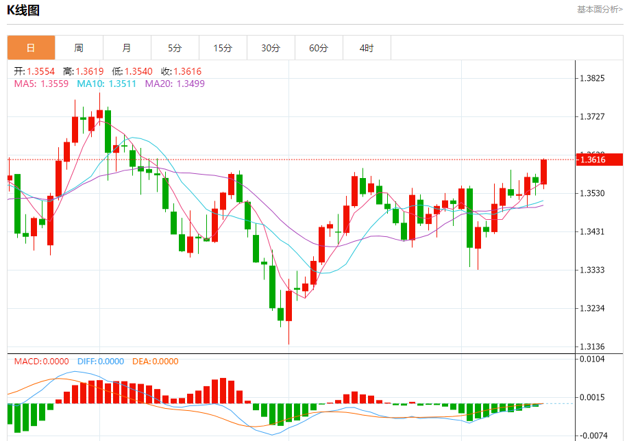 汇价高见1.3619,低见1.3548。上一交易日,汇价收于1.3559。
