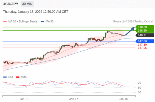 在 147.60 之上,看涨,目标价位为 148.50 ,然后为 148.80 。