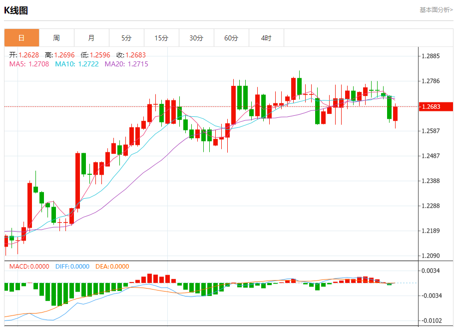 汇价高见1.2696,低见1.2596。上一交易日,汇价收于1.2636。