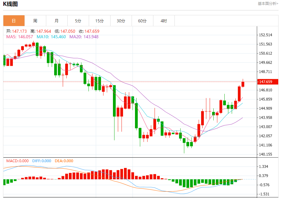 汇价高见147.964,低见147.050。上一交易日,汇价收于147.174。