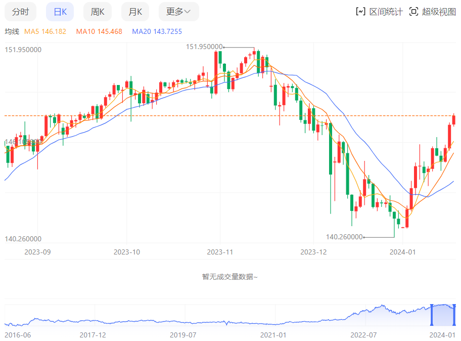 周三(1月17日),美元/日元上涨,暂报147.70,涨幅0.33%。