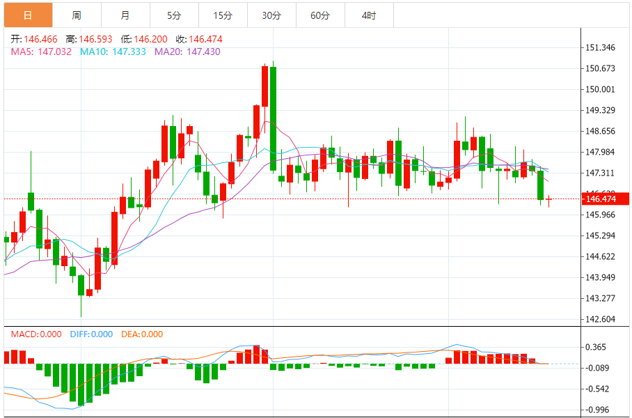 周三(9月17日),美元/日元下跌146.527,暂报146.499,涨幅0.03%。