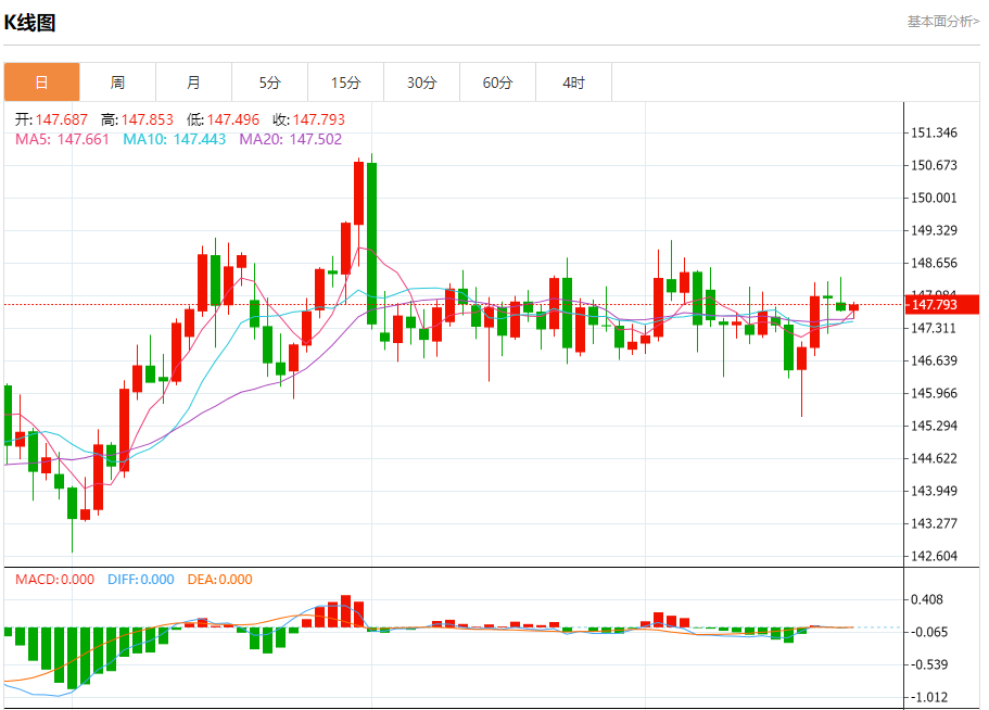 汇价高见147.853,低见147.496。上一交易日,汇价收于147.708。