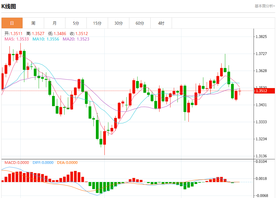 汇价高见1.3527,低见1.3486。上一交易日,汇价收于1.3513。
