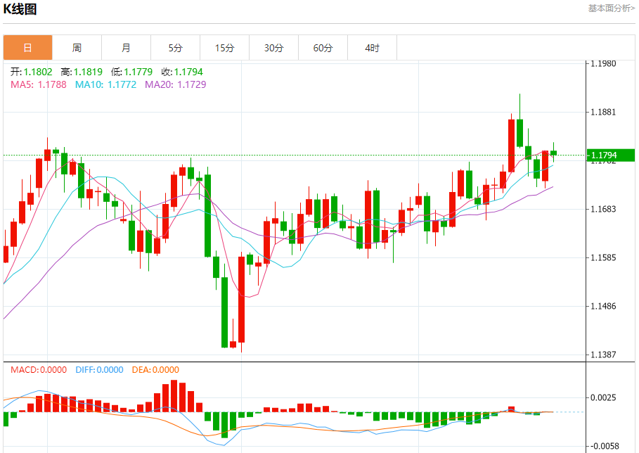 汇价高见1.1820,低见1.1779。上一交易日,汇价收于1.1803。