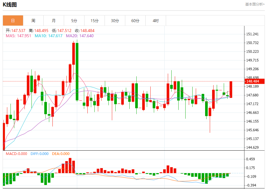 汇价高见148.486,低见147.504。上一交易日,汇价收于147.635。