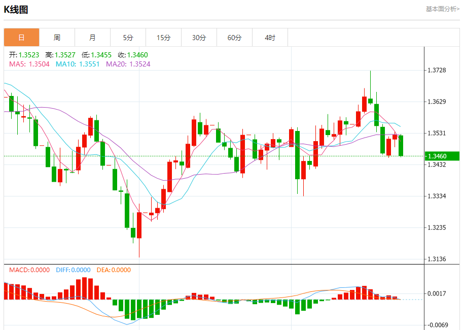 汇价高见1.3527,低见1.3455。上一交易日,汇价收于1.3525。