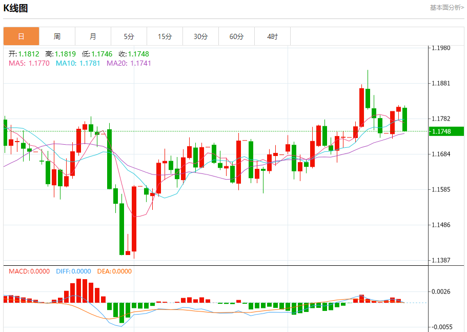 汇价高见1.1818,低见1.1746。上一交易日,汇价收于1.1815。