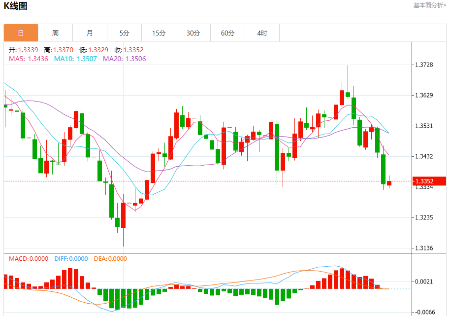 汇价高见1.3370,低见1.3329。上一交易日,汇价收于1.3342。