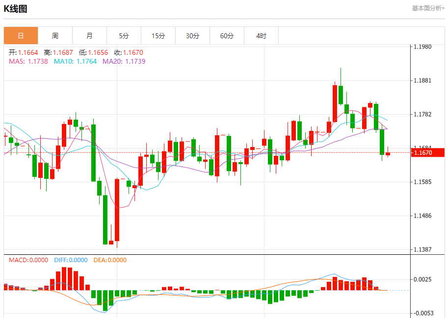 汇价高见1.1688,低见1.1656。上一交易日,汇价收于1.1663。