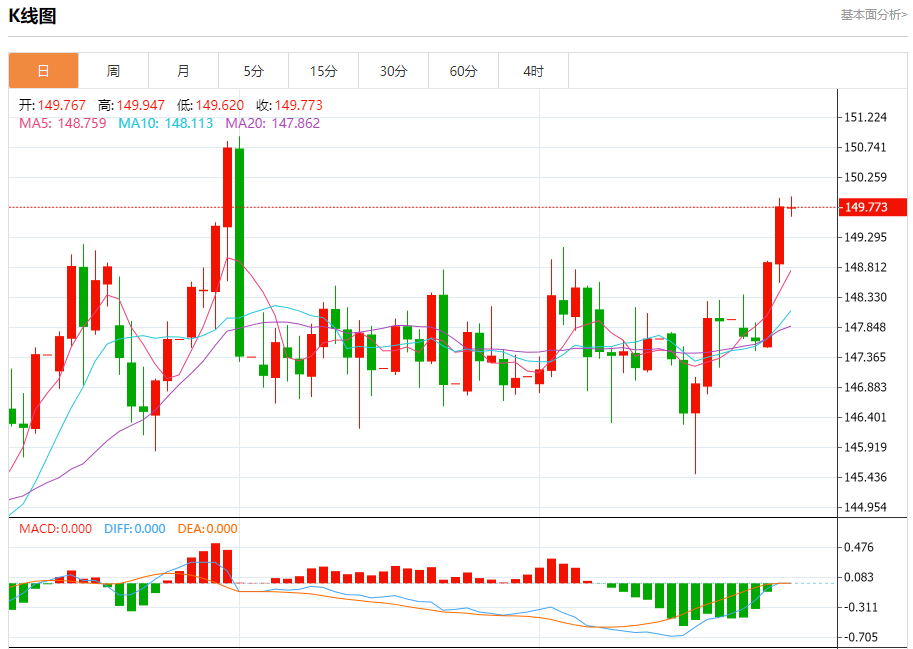 汇价高见149.947,低见149.620。上一交易日,汇价收于149.773。
