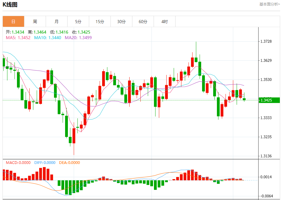 汇价高见1.3464,低见1.3416。上一交易日,汇价收于1.3479。