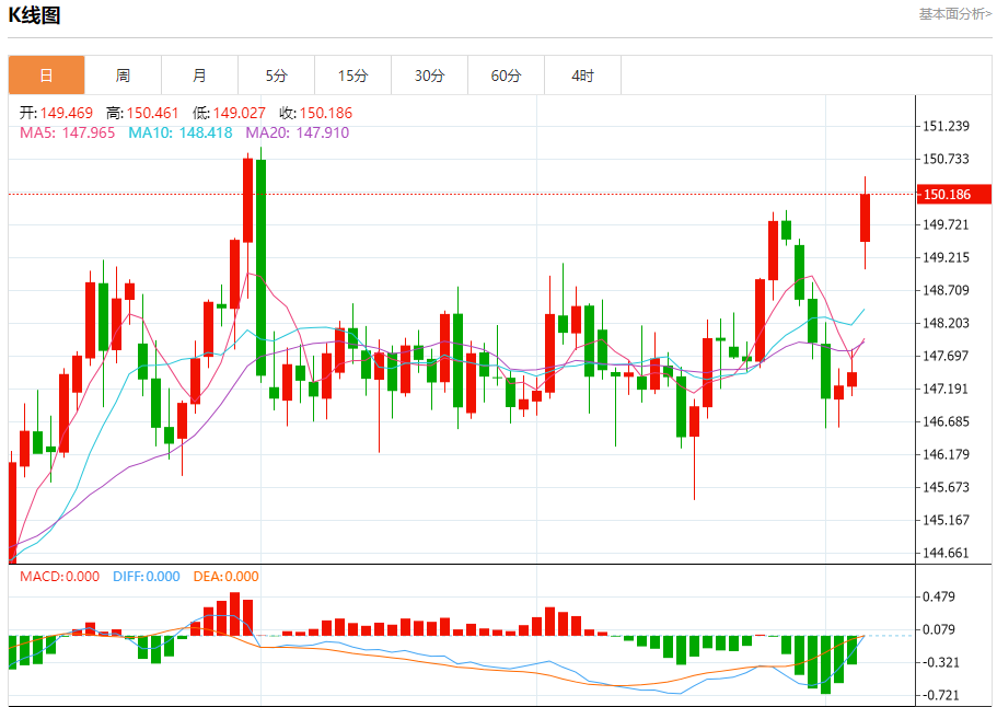 汇价高见150.472,低见149.002。上一交易日,汇价收于147.456。