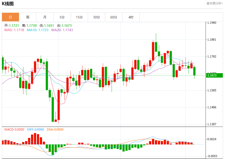 汇价高见1.1731,低见1.1651。上一交易日,汇价收于1.1739。
