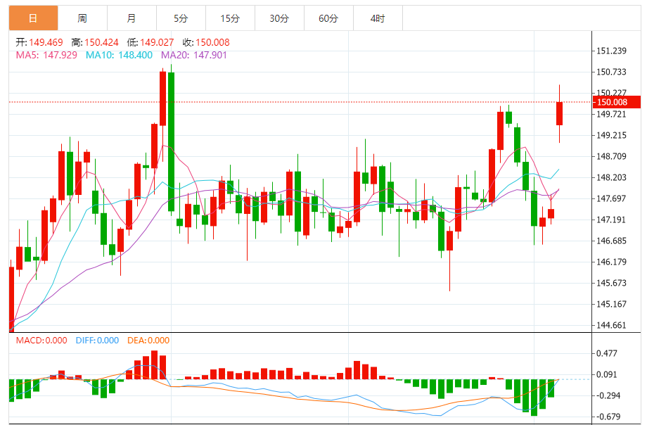 周一(10月6日),美元/日元上涨150.029,暂报150.001,涨幅1.74%。