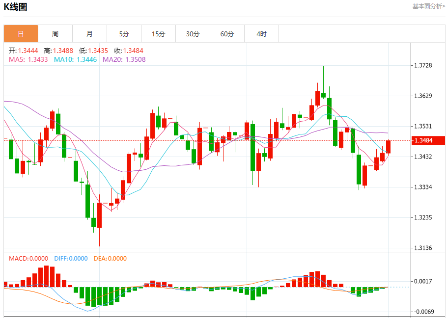 汇价高见1.3488,低见1.3434。上一交易日,汇价收于1.3444。