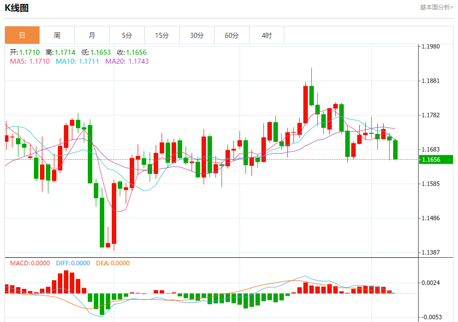 汇价高见1.1714,低见1.1653。上一交易日,汇价收于1.1708。