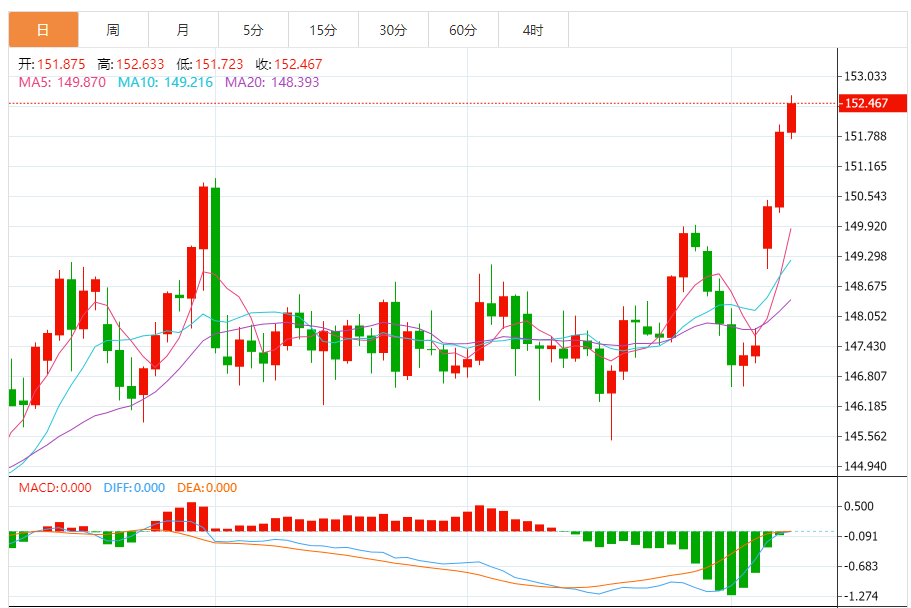 周三(10月8日),美元/日元上涨152.522,暂报152.494,涨幅0.40%。