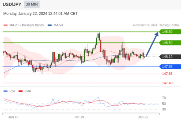 在 147.85 之上,看涨,目标价位为 148.50 ,然后为 148.80 。