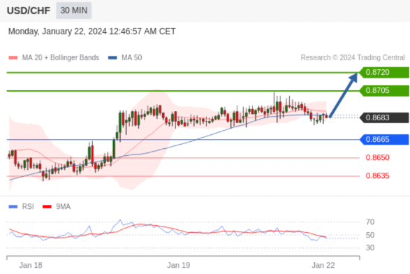 在 0.8665 之上,看涨,目标价位为 0.8705 ,然后为 0.8720 。