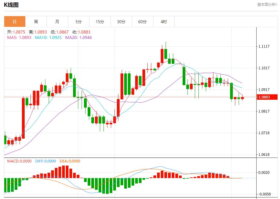 汇价高见1.0893,低见1.0867。上一交易日,汇价收于1.0876。