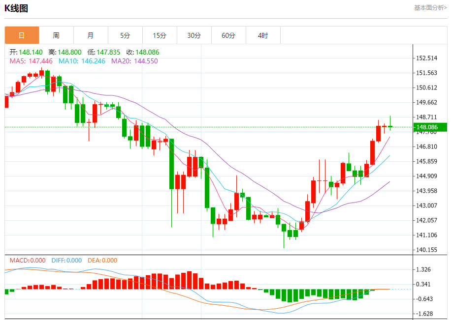 汇价高见148.800,低见147.835。上一交易日,汇价收于148.139。