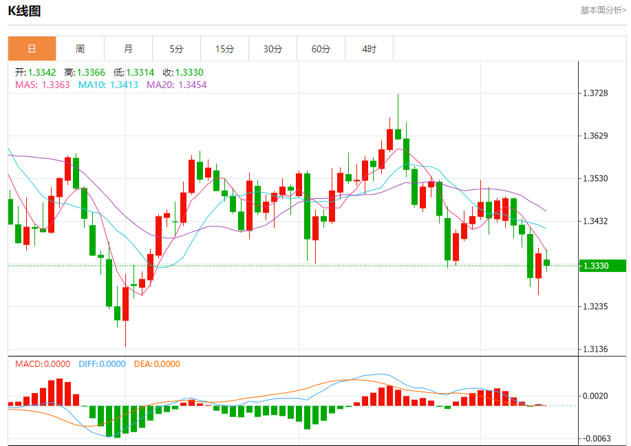 汇价高见1.3366,低见1.3314。上一交易日,汇价收于1.3346。