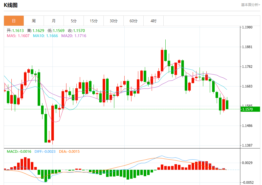 汇价高见1.1629,低见1.1572。上一交易日,汇价收于1.1619。