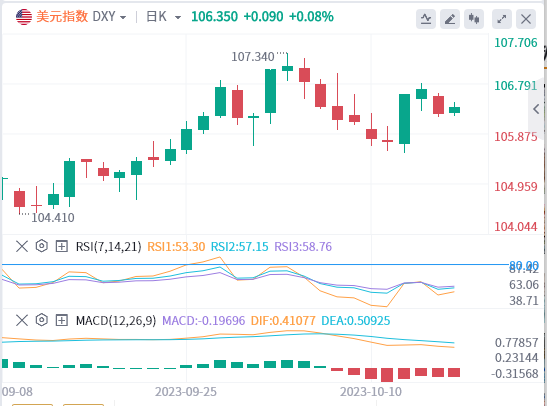 美元指数上涨0.12%,报106.33,突破106.78(10月13日高点)后可能触及107.34(2023年10月3日高点),最终触及107.99(2022年11月21日高点触及107.99(2022年11月21日高点触及107.99(2022年11月21日高点点)。另一方面,下一个支撑位在105.53(10月12日低点),然后是104.42(9月11日低点)和103.23(200日均线)。