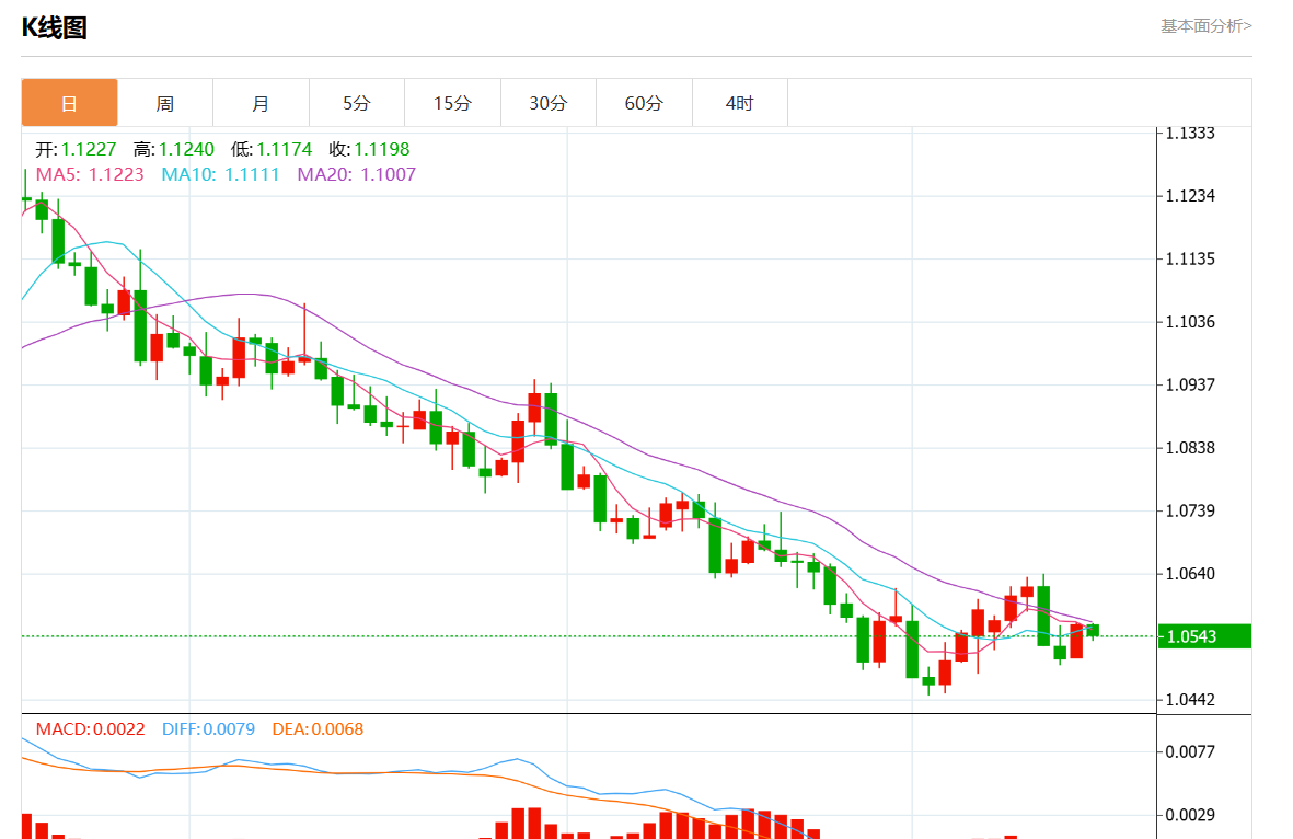 周二欧市盘中,欧元/美元最新报1.0545,日图跌0.15%.