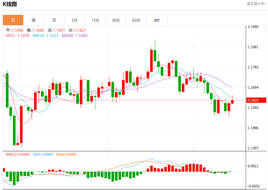 汇价高见1.1645,低见1.1601。上一交易日,汇价收于1.1606。