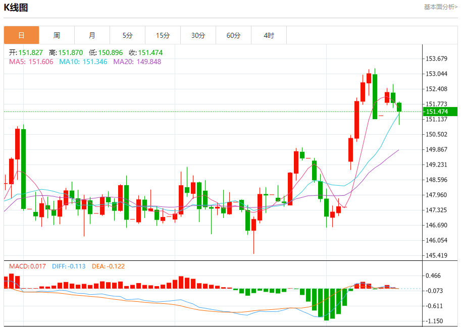 汇价高见151.860,低见150.888。上一交易日,汇价收于151.837。
