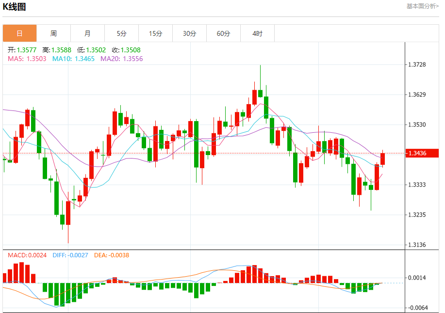汇价高见1.3447,低见1.3389。上一交易日,汇价收于1.3400。