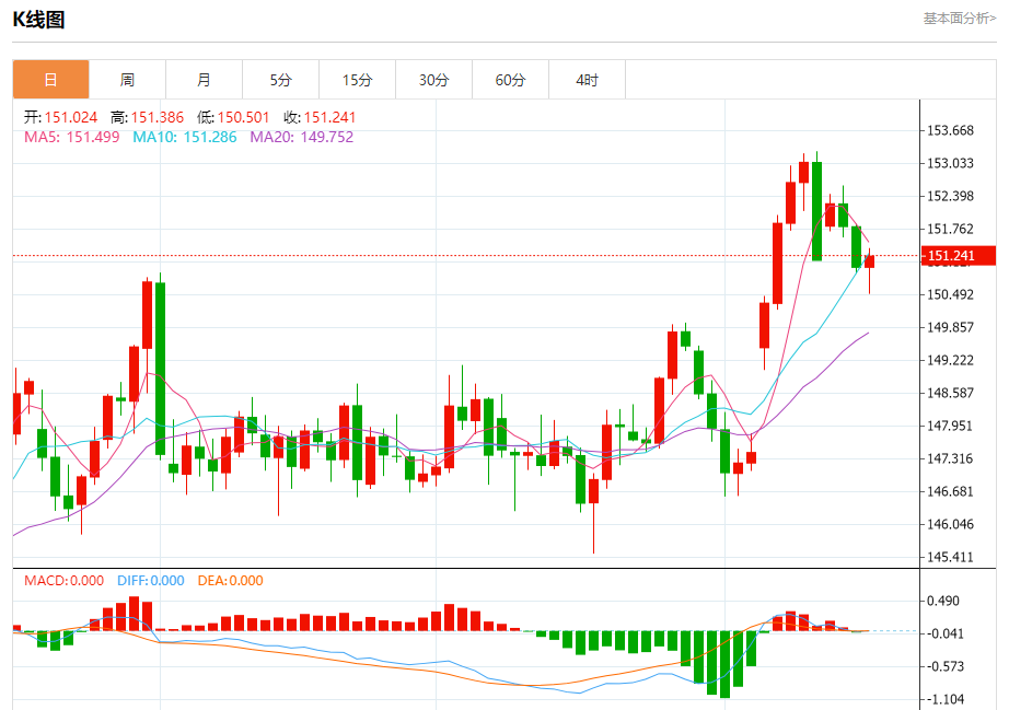 汇价高见151.386,低见150.501。上一交易日,汇价收于151.025。