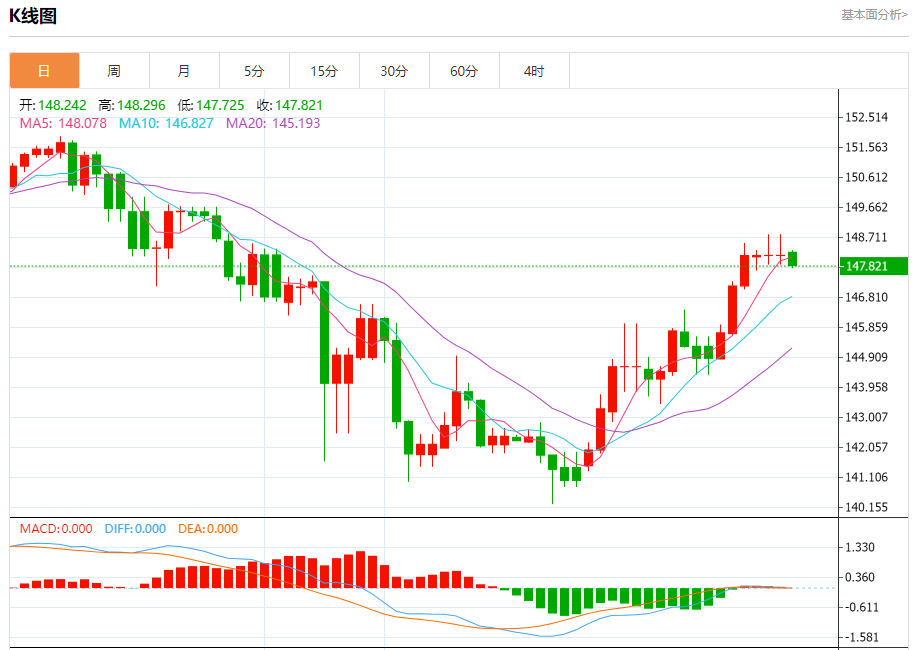 汇价高见148.296,低见147.725。上一交易日,汇价收于148.146。