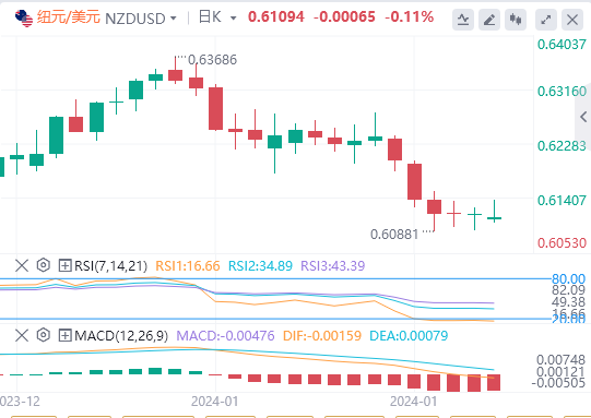 新西兰方面,周五公布的新西兰商业制造业表现指数(PMI)出现萎缩。该指数降至43.1,低于前值46.5。这表明新西兰制造业面临潜在挑战。展望未来,市场参与者将密切关注定于周三公布的新西兰消费者价格指数(CPI)数据。市场预期第四季度的消费者物价指数将有所下降。