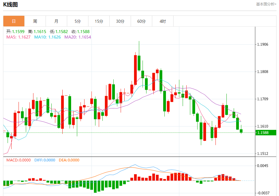 汇价高见1.1615,低见1.1582。上一交易日,汇价收于1.1599。