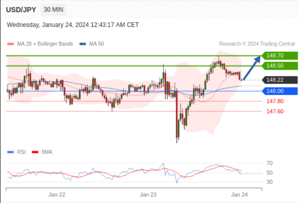 在 148.00 之上,看涨,目标价位为 148.50 ,然后为 148.70 。