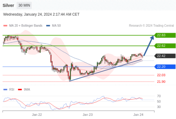 在 22.20 之上,看涨,目标价位为 22.62 ,然后为 22.83 。