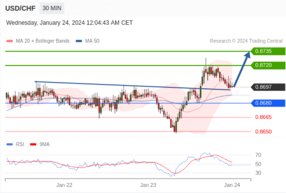 在 0.8680 之上,看涨,目标价位为 0.8720 ,然后为 0.8735 。